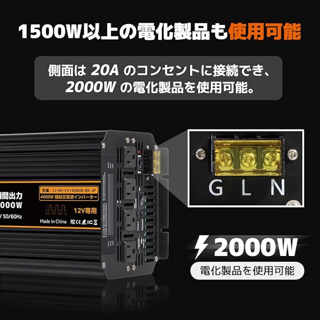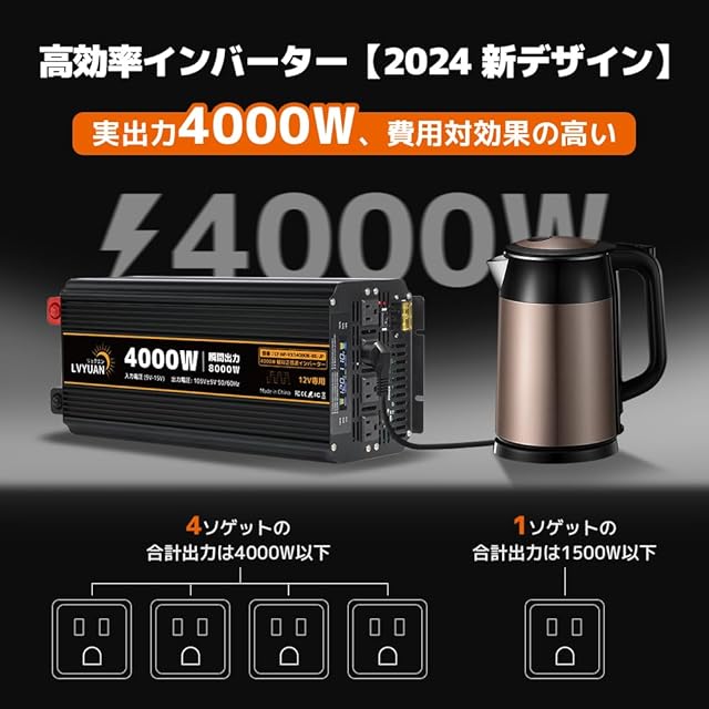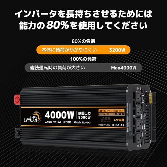 【新登場】 インバーター 12V 100V 4000W 修正波インバーター LVYUAN【正規品】50HZ/60HZ切替 定格出力 4000W 瞬間最大出力(1S)8000W DC12V TO AC100V 変換 リモコン機能付き 保護機能付き ACコンセント×4 地震 防災用品 自動車 船 停電の対策 (4000W12V)