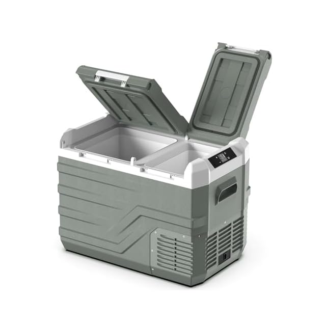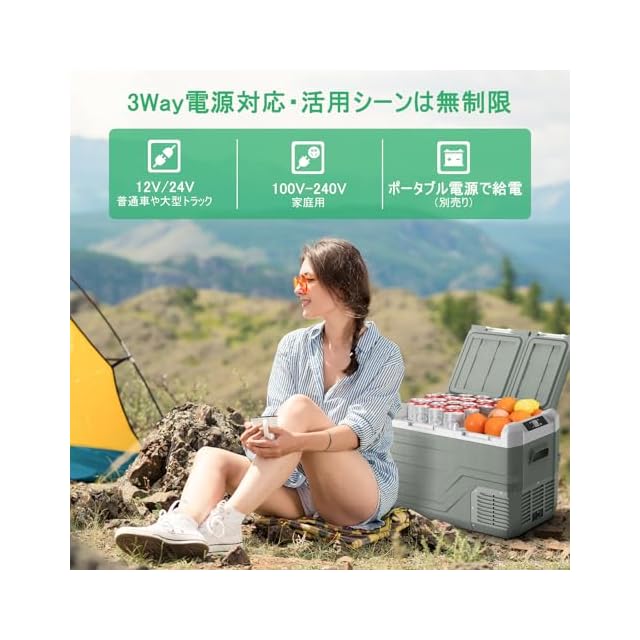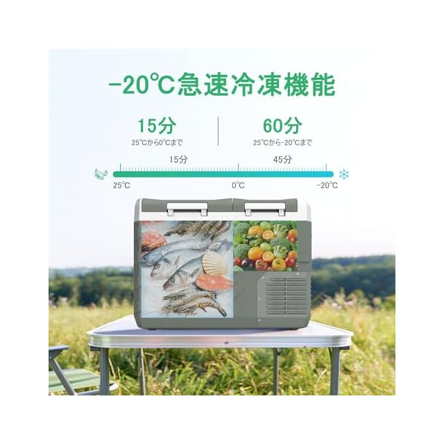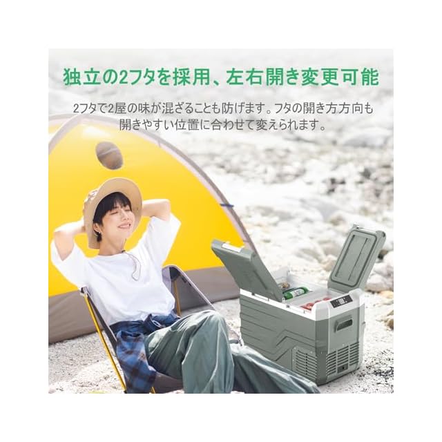 【2室独立温度制御】車載 冷蔵庫は左右に分かれた二室を、別々の温度に設定できることです。それにより、冷凍品と冷蔵品をこれ一つで同時に収納できます。例えば、左室は6℃で食材や飲み物を冷蔵し、右室は₋20℃で冷凍食品や氷を冷凍しておけます。冷凍と冷蔵が庫内で仕切られているため、各食材に合わせた温度を保つことができ、遠くのキャンプ場に出かけた際でも新鮮な食材を味わうことができます。