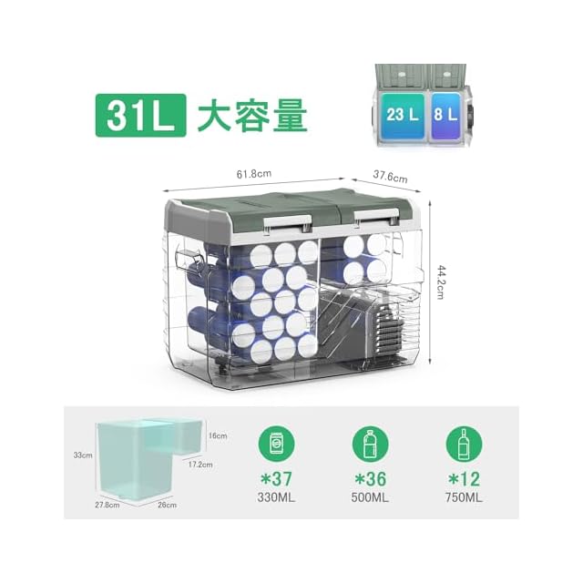 【大容量車用冷蔵庫】31Lの大容量で330ml缶が37本、500mlのペットボトルが36本、750mlのビンが12本を収納できます。数日間の車中泊や大家族でのお出かけでも、食材や飲み物をたっぷり冷やすことができます。また搭載する2室には、個別にドアを備えています。リバーシブルドアなので、開ける方向を切り替えられます。各フタの開き方向も開けやすい位置や利き手に合わせて自由に変えられので便利です。
