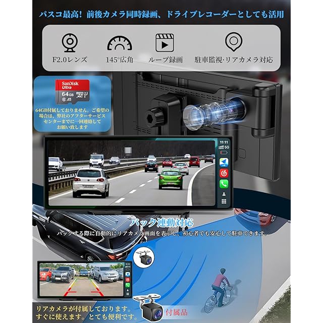 【パスコ最高!前後カメラ同時録画、ドライブレコーダーとしても活用&Bluetooth通話・音楽&駐車補助機能搭載(リアカメラ付属)】✔このカーディスプレイは前後カメラを搭載し、前方と後方の状況を同時に記録可能。ドライブの安全をしっかりサポートします。さらに、フロントカメラは180°回転できるので、前方の記録はもちろん、車内の様子も自由な角度で撮影可能。家族旅行での思い出作りにぴったりです!。※録画にはmicroSDカードが必要です。弊社の活動を参加し、64GBカードを無料で提供可能です、お気楽にご連絡ください。連絡先:説明書の最後のページを参照してください✔最新Bluetooth 5.0対応で、安定した通話・音楽再生が可能。接続切れの心配なく、大事な連絡も逃しません。✔駐車時はバックギアに連動して自動でリアカメラ映像に切替。死角や障害物が確認しやすく、安全・スムーズな駐車をサポートします。※バックカメラは標準付属。別途購入の必要はありません。