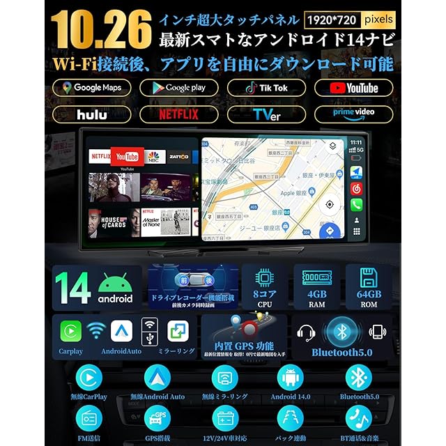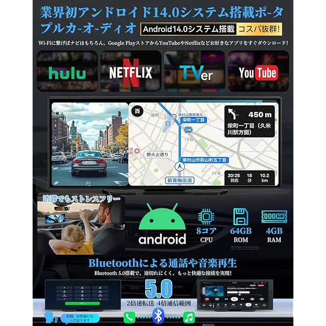 【NZACE Android14搭載ポータブルディスプレイオーディオ&8コアCPU+4GB RAM+64GB ROMで快適カーライフ】本製品はAndroid14搭載で、Wi-Fi接続により最新のオンライン地図やGoogle Playの各種アプリを自由に楽しめます。YouTube、Netflix、Prime Videoなどの動画も、10.26インチの大画面で快適に視聴可能。パワフルな8コアCPUにより、高速かつ安定した動作を実現。4GB RAM+64GB ROMの大容量で、複数アプリの同時利用やデータ保存もスムーズです。日々のドライブがもっと楽しく、便利に!【ご使用上の注意】①ストレージが不足すると、アプリが正常に動作しない場合があります。不要なデータは定期的に削除してください。②通信環境によっては動作が遅くなることがあります。③iPhone使用時、「インターネット共有」画面を開いていないと、約90秒で自動的にテザリングが切断される場合がありますのでご注意ください。