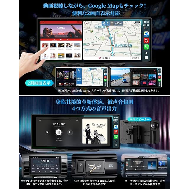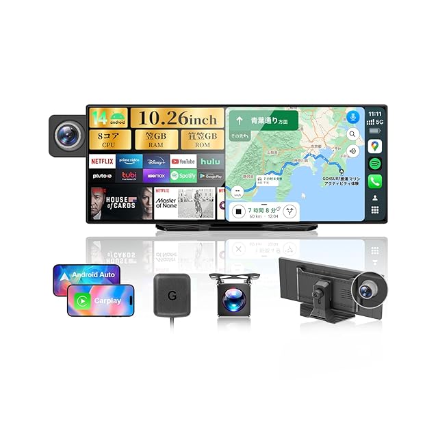 【ワイヤレスCarPlay・Android Auto&ミラーリング対応!快適でスマートなドライブを実現】✔スマートフォンをワイヤレスで接続するだけで、ナビ、通話、音楽、天気などのアプリをディスプレイで操作可能。スマホを取り出す手間なく、便利な機能をすぐに使えます。✔SiriやGoogleアシスタントによる音声操作にも対応し、ハンズフリーで目的地検索や通話もスムーズ。運転中の安全性も向上します。✔完全ワイヤレス接続により、ケーブルの煩わしさから解放され、車内もすっきりきれいに。※本製品はワイヤレス接続専用です。✔スマホで見つけた動画や記事なども、ワイヤレスミラーリングで10.26インチの大画面に映してすぐに楽しめます。※一部の動画アプリは著作権保護のため対応していない場合があります。