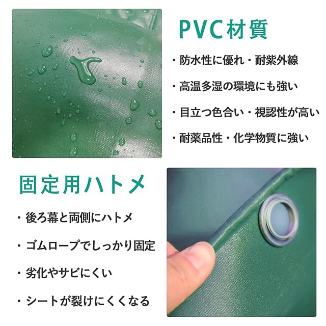 防水性:キャビン後部の満にぴったりシートがかぶるため、雨が荷台に入りにくくなります。生地が水に触れることで腐食やカビの発生を抑えるため、水に近い環境での使用にも適するトラック幌です。色落ちしにくく、長時間使用しても色褪せが少ないです。(完全防水ではありません)