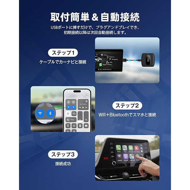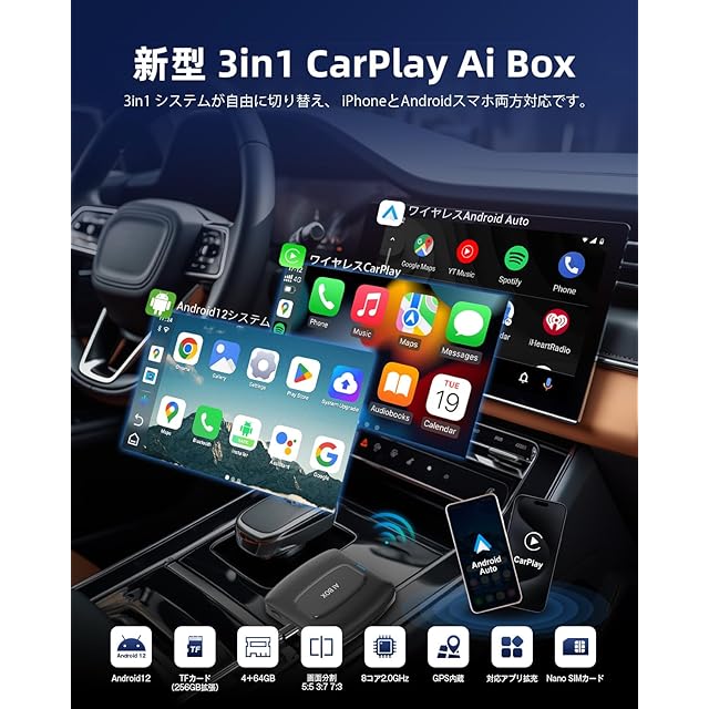 ★【3in1 CarPlayメディアボックス】新型3IN1のデザインで、Android 12システム、ワイヤレスCarPlay、ワイヤレスAndroid Autoが自由に切り替えるコスパ高いCarPlay Ai Boxです。すべての有線CarPlay機能をワイヤレス(無線)に変換し、音声制御やタッチスクリーン制御を通し、音楽、GPSナビゲーション、ボイスメール、通話、通知、メッセージなどのスマホの機能をアクセスできます。 iPhoneとAndroidスマホ両方対応でき、車内でスマホを使用するより安全な方法です。