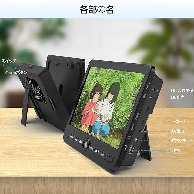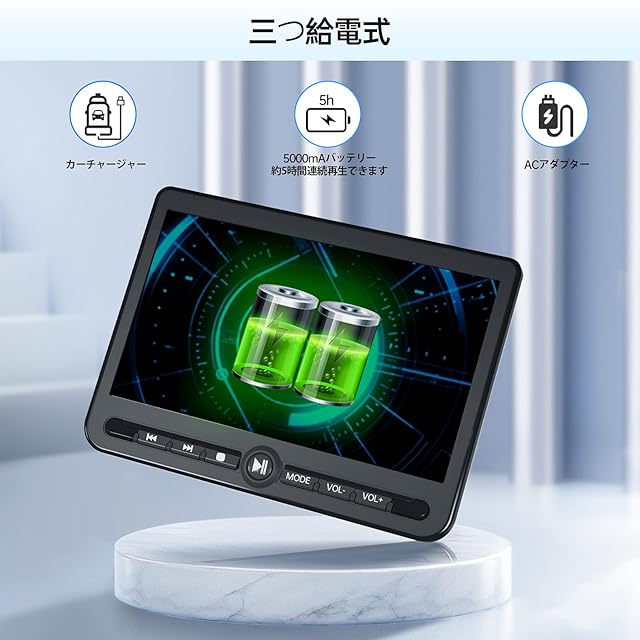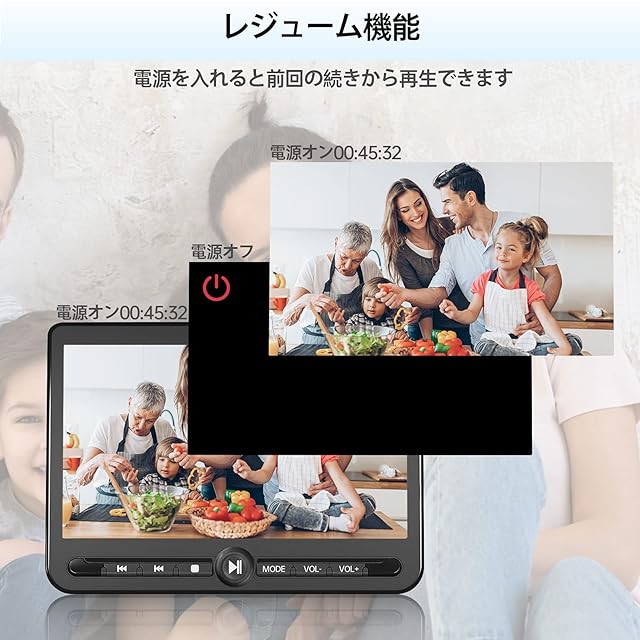 【バッテリー内蔵 ・ レジューム機能搭載】この製品はバッテリーを内蔵しており、シガーソケットや家庭用AC電源からの供給に加え、フル充電で最大5時間の連続再生が可能。外出時や電源の確保が難しい状況でも、長時間にわたり映像をお楽しみいただけます。さらに、レジューム機能を搭載しているため、再生途中で電源を切った場合でも、次回は前回の続きから視聴を再開できます。