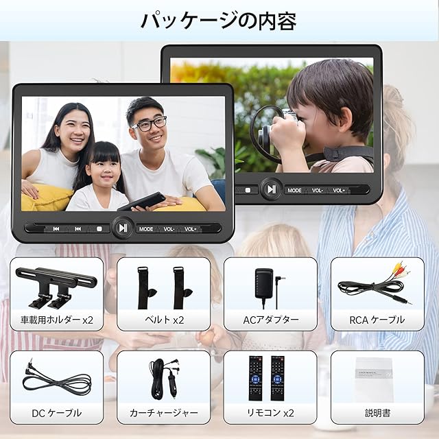 【パッケージ内容 ・ 12ヶ月保証付き】ヘッドレストモニター2個、車載ホルダー、シガーソケット、ACアダプター、AVケーブル、リモコン、DCケーブル、日本語取扱説明書。保証期間内で、本体に不具合がある場合、カスタマーサポートや出品者までにご連絡くださいますようお願い申し上げます。(部品は保証外です)