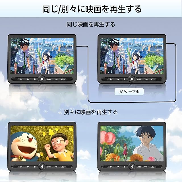 【ヘッドレストモニター ・ 同じ/別々に映像の再生可能】このヘッドレストモニターは、2個セットで同じ映像を楽しむことも、別々の映像を楽しむこともできる多機能設計です。本体でDVDを再生し、付属のケーブルを使用してもう一方のモニターに映像を送信することで、同時に映像を共有することが可能。また、独立して映像を再生する機能も備えており、異なるニーズに柔軟に対応。これ一台で、車内での快適な時間をさらに充実させることができます。