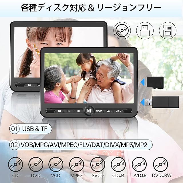 【各種メモリ対応 ・ ディスクのフォーマット】このヘッドレストモニターは、様々なメモリフォーマットに対応しています。CD、DVD、DVD-R/+R、DVD-/+RW、CD-R/-RW、VCD、SVCD、デジタルオーディオ、JPEG、MP3形式のファイルに対応し、USBメモリやSDカードもサポートしています。USBポートに接続することで、保存されている映画、画像、音楽を楽しむことができます。最大64GBのUSBメモリ(FAT32フォーマット)に対応しています。ただし、ブルーレイプレーヤーではなく、ブルーレイディスクには対応していないことに注意してください。