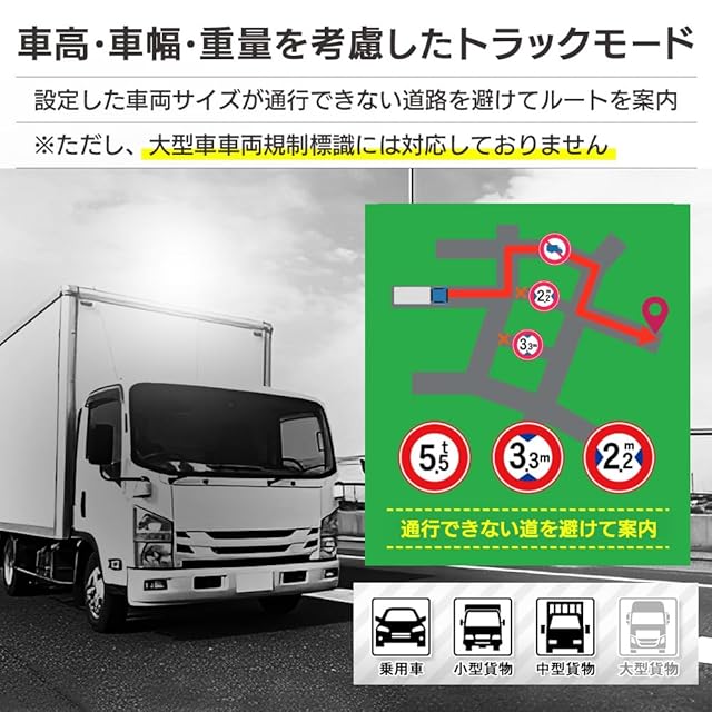 【 トラックモード搭載モデル 】 車両情報(全高・全幅・重量)を設定すると、車両が通行できるルートのみを案内します。「幅員考慮」「車両規制標識アイコン」を表示