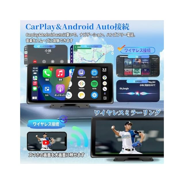 【ワイヤレス化へ進化したCarPlay&Android Auto機能】有線接続から解放!CarPlayカーナビ、Android Autoカーナビに対応します。スマホのナビ地図、電話、音楽、ポッドキャストなどのアプリがモニターに同期され、大画面のディスプレイオーディオで普段スマホでお使いの最新地図を使用できます。「Hey,Siri」と「OK,Google」にも対応して、android auto モニターから目を離さずに行き方を調べたり、メッセージを送受信したりできるので、 運転集中もできます。ワイヤレス接続により、煩わしいケーブルの取り扱いも不要になります。【 iPhone/Androidとも対応できるワイヤレスミラーリング】ディスプライオーディオ ミラーリングとはスマホの小さい画面をモニターに映して、大画面でスマホの動画を楽しんだり、新聞を読んだりします。オンダッシュモニターの11.5インチ大画面で、顔を近づける必要もなく、目に優しいです!※著作権保護により、対応できないアプリもあります。※CarPlay&Android Auto&ミラーリングはワイヤレス接続のみ対応できます。