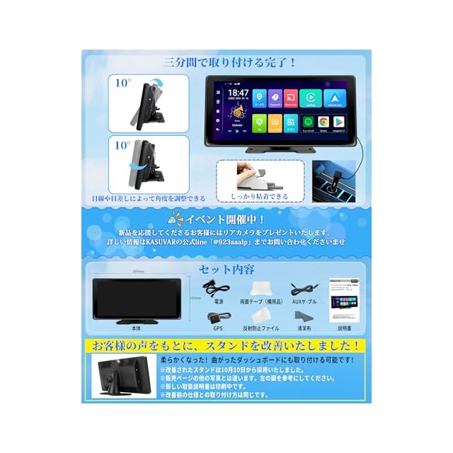 【3分間で取り付け完了のアンドロイドディスプレイオーディオ】両面テープでをダッシュボードに貼って、シガーアダプターをシガーソケットに挿入して設置完了です。ディスプレイオーディオの設置が苦手な方にとっても楽です。通常のカーナビと比べて、嵌め込む枠の大きさに合わないかどうか心配がない。【12~24V車に対応可能】軽自動車からトラックまで幅広い車に取り付けることができます。【技適マーク認証取得済】番号:210-238103【あす楽対応・12ヶ月安心保証】12ヶ月の保証期間内、製品の不具合や問題が発生した場合、ぜひお気軽に公式LINE(@923aaalp)、メール(service01@kasuvar.com )またはアマゾンご連絡くださいませ。