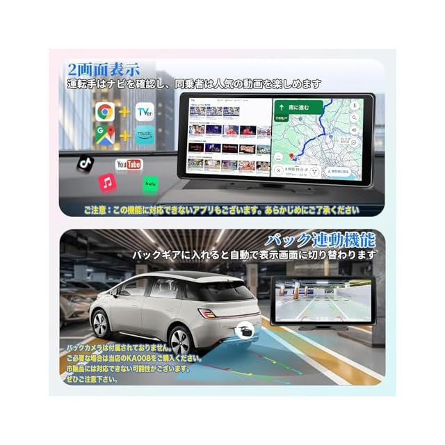 【便利かつ効率化の2画面表示】アンドロイドナビはタブレットのように、2つのアプリを並んで同時に操作できます。お気に入りの動画を視聴しながら友人や家族とメッセージのやり取りをしたり、天気予報をチェックしたり、カレンダーの予定を確認したりと、さまざまな使い方が可能です。ご注意:対応できないアプリもございます。安全のため、運転中はナビゲーションを優先し、動画の視聴はお控えください。【駐車サポートバック連動機能、ガイドライン表示可能】アンドロイドナビにバックカメラを接続したら、バックギアを入れると自動的にバックカメラの画面に切り替わります。ご注意:バックカメラは付属しておりません。市販品に対応できないので、ご必要な場合は当店のKA008をご購入くださいませ。【安定性UPのBluetooth5.0電話&音楽】カーオーディオBluetooth電話&音楽によりハンズフリー電話をご利用いただけます。Bluetooth 5.0を搭載しているため、伝送速度が向上し、接続の安定性も大幅にアップしました。クリアでスムーズな通話や音楽を楽しめましょう。
