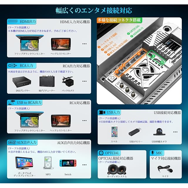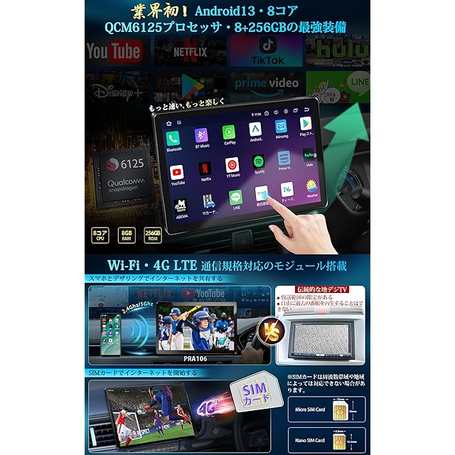 【ワイヤレスCarPlay/Android Auto対応・ケーブルの煩しさから解放】ワイヤレスでのCarPlayナビとAndroid Autoナビに対応。スマートフォンと簡単に接続でき、ナビゲーション、音楽、メッセージ送受信などの機能を車内でシームレスに利用可能です。ケーブルの煩わしさから解放され、スマートなドライブ体験を提供します。【ワイヤレス・有線対応ミラーリング機能】ワイヤレスおよび有線でのAirplay、Miracast機能も完備。スマートフォンの画面を車のディスプレイにそのまま映し出すことができ、動画視聴やアプリの使用が可能です。大画面でスマートフォンのコンテンツを楽しむことができ、エンターテインメント性が大幅に向上します。【2WAYインターネットを簡単に繋げる】①2.4G/5GWi-Fiに対応:スマホ端末のデザリング機能・車載Wi-Fiの利用でインターネットを簡単に接続できます。②SIMカード接続:直接的にSIMカードを機器と接続してドライブ中に途切れることなくインターネットを利用でき、ナビゲーションやエンターテインメント機能を最大限に活用できます。