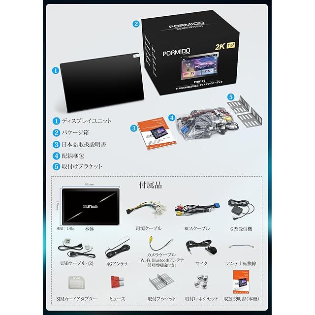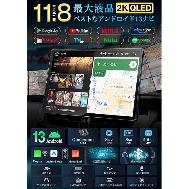 PORMIDO 2024新型11.8インチ 2K/QLED液晶のAndroid13カーナビ【最高8コアQCM6125 8+256GB】WiFi/SIMカード対応 YouTube Hulu等が観れる1DINディスプレイオーディオ ワイヤレスCarPlay/AndroidAuto/Mirrorlink HDMI出力 Bluetooth/DSP/GPS内蔵 バック連動 技適取得済み品【PRA106】