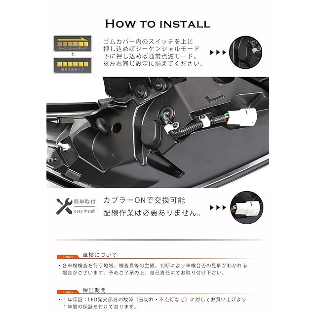 ■機能紹介:スモール連動(2本のラインが車両内側から外側に向かって集まる滑らかなデザイン。)/ウインカー連動(水平に点灯するキューブブロック。流れるウインカーモードと、通常の点滅モードの2タイプ。製品背面のスイッチで切り替えが可能。)/ブレーキ連動(外側に向かって少し上がるスタイリッシュな並びのキューブブロック。スモールの曲線と合わさって一体感を演出しています。)/ウインカーモード切替スイッチ(製品背面の黒いゴムカバー内部にスイッチがあります。上へ押し込むとシーケンシャルモード。下へ押し込むと通常点滅モード。※左右の設定を揃えるようにしてください。)