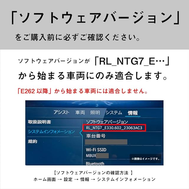 ※ソフトウェアバージョンが 「RL_NTG7_E…」から始まる車両にのみ適合します。「E262以降」から始まる車両には適合しません。【ソフトウェアバージョンの確認方法】ホーム画面 → 設定 → 情報 → システムインフォメーション