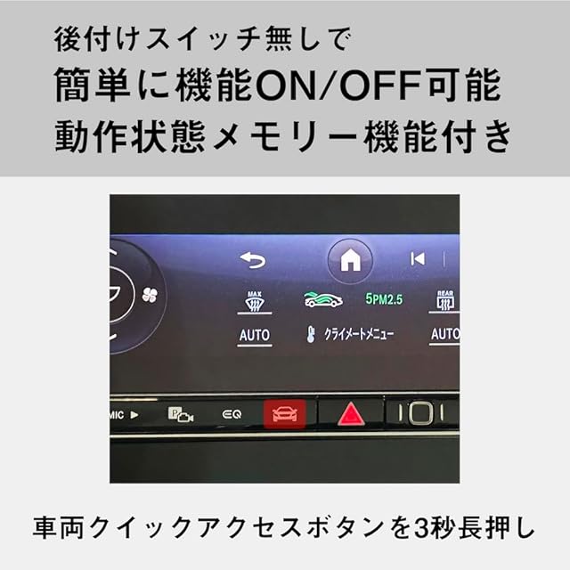 車両クイックアクセスボタンを使用して機能のオンオフを切り替えることができます。外付けスイッチが不要ですっきりとしたお取り付けが可能です。