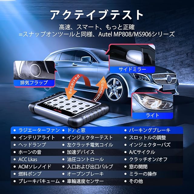 【双方向制御=アクテイブテスト】:MaxiCOM MK808 MX808の2アップグレードバージョンとして、MK808S自動車診断機は、MK808Sを最もコスト効率の高いAutel診断機にする強力な双方向制御を備えています。 アクティブ テストは、車のアクチュエータがすべて良好な状態にあるかどうかを確認するために、車のサブシステムで広く使用されています。 ウインドウ、バックミラー、サンルーフ、ワイパーなど。