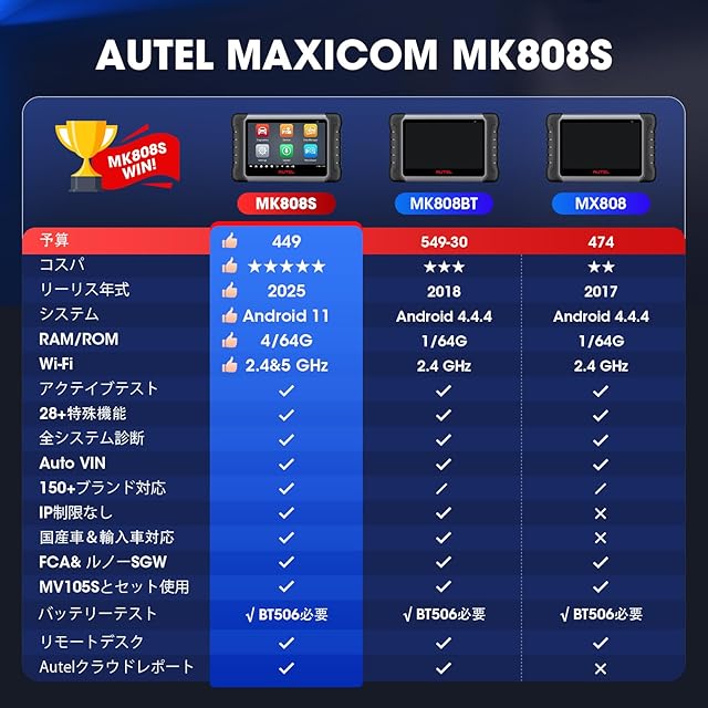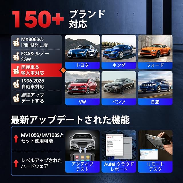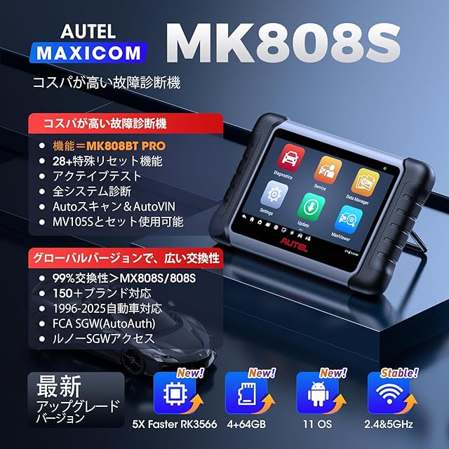 【MX808 MK808のアップグレード版】:ビッグサプライズ! Autel は MK808 を MK808S にアップグレードしました。 同じコストで、5 倍高速な診断スピードと 150 自動車ブランドを診断できます。AUTEL診断機 MK808Sは、より高速なCPU ROCKCHIP RK3566、改良されたAndroid 11、より大きな4+64GB、5Gおよび2.4 GHzのデュアルWi-Fi、新しく追加されたWi-Fiプリント、アクテイブテストおよびFCAを備えています。