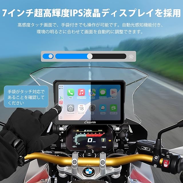 Carpuride バイクナビ スマートモニター コントローラー操作はでき B/MW原車輪制御できる ディスプレイオーディオ ワイヤレス アンドロイドナビCarplay Android Auto ポータブル カープレイ Bluetoothインカムを適用 7インチ IPS 音声コントロール/音楽共有/通話 日本の技適取得済み 日本語説明書 取付簡単 IP67(W702proBS)