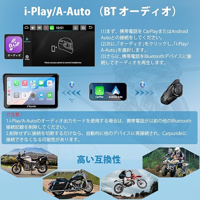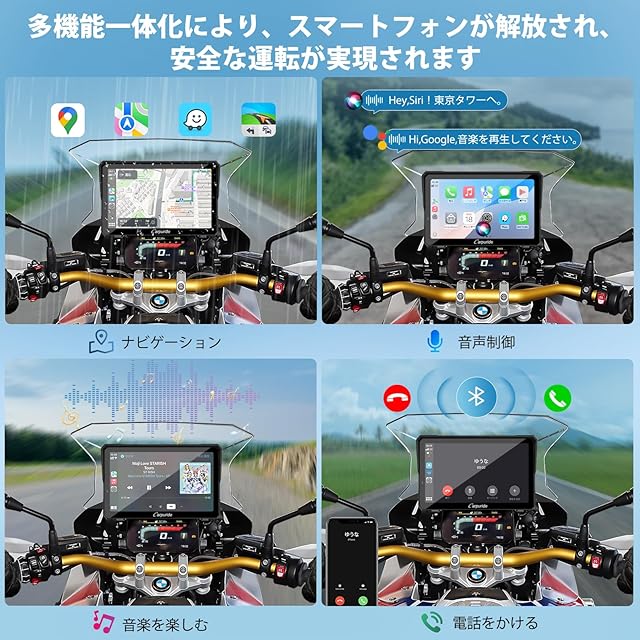 [スマートなドライビング体験 ]-バイクナビは Apple CarPlay、Android Autoに対応、ワイヤレス化を実現し、スマートフォンと連携して、電話をポケットに入れながらも快適にナビゲーションや音楽を楽しむことができます。音声ガイド機能により、目標地点へのルート確認も簡単。リアルタイム交通情報を活用し、最適な経路を提供します。(ほとんどの AQUOS 製携帯電話は互換性がなくので、もしお客様の携帯電話がAQUOS の場合は購入しないでください)
