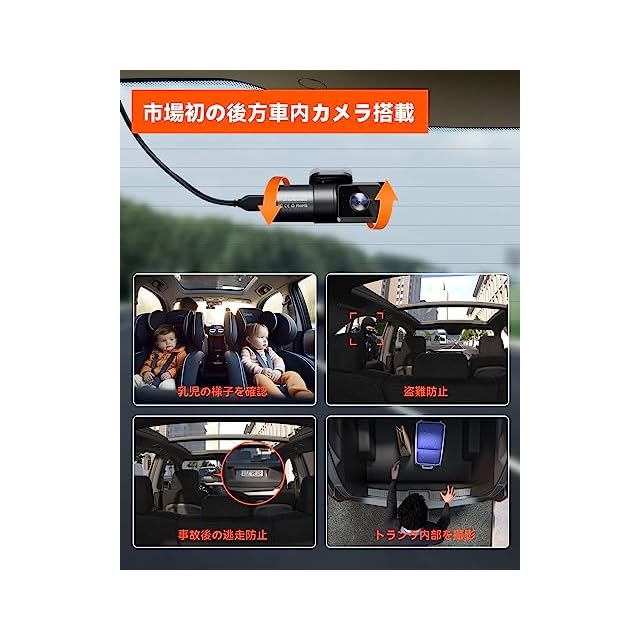 【業界初の後方の車内カメラ搭載】VANTRUE N5ドライブレコーダーは従来の3カメラ式の車載カメラよりも優れている点が後方車内カメラを装備していることです。後方の車内カメラにより、左右の窓ガラスが割られたり、盗難に遭った場合やドアパンチされたかの確認が可能となっているため、安心してクルマを駐車できます。また、後方車内カメラによって、チャイルドシートに座る乳児の様子を気軽に確認できるので、子育て中の親御さんに最適です。更に、前方車内カメラと後方車内カメラの組み合わせにより、車内の状況だけでなく、車両の側面が他の車と衝突事故に遭った際、事故の全過程を正確に撮影できるため、事故責任の特定に役立ちます。大型SUVなどの場合、トランクを開けた状態でトランク内部の状況を撮影可能です。