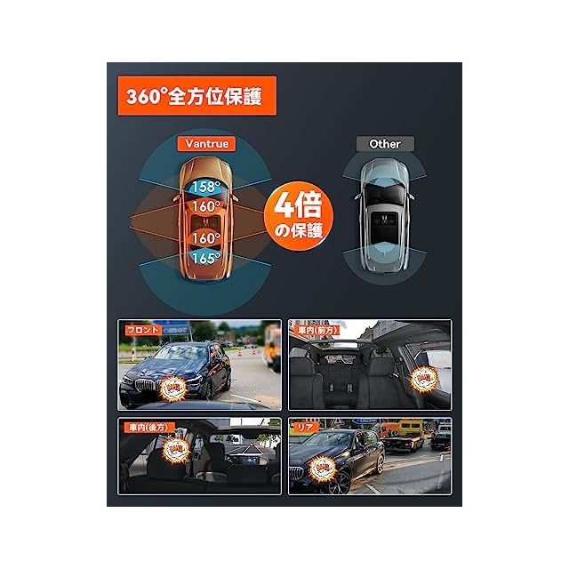 ★★★ご注意:電源ケーブルとリアカメラケーブルに変換アダプターを使用しないでください。変換アダプターを使用すると、本体の動作に悪影響を及ぼす可能性がございますので、ご了承ください。 【4カメラドライブレコーダーが新登場!】 市場初となる4つのカメラを搭載した驚きのVANTRUE N5ドライブレコーダーが登場しました!360°カメラの特性上、歪みが出やすく解像度が不十分な場合がありますが(前方車両のナンバープレートなどがしっかり撮影できない場合がありますが)、この画期的な製品N5は前方・前方車内・後方車内・後方の4カメラで同時に全方向を撮影でき、圧倒的な魅力を提供します。最高画質は前方が2.5K(1944P)、他の3つのカメラは1080Pとなり、驚くほど高精細な録画が可能です!広範囲をカバーする158°+160°+160°+165°の大視野角で、あらゆる方向からの映像を緻密に捉えます。まさに死角無しの360°全方位撮影を実現し、安全性と鮮明な映像を追求した逸品です!