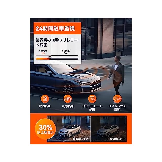 【4種類24時間駐車監視&動体検知範囲調整&駐車低照度暗視機能】別売の直結電源ケーブル(B094882TJC、B0C7QS98BB、B0B7NGCTGQ)を使用すれば、進化版の4種類(動体検知、タイムラプス録画(省スペース)、衝撃検知(低消費電力)、低ビットレート録画(省スペース))の駐車監視機能を使用できます。動体検知モードに革新的な10秒プリレコード録画機能が搭載されております。より正確に事件の経緯を再現できます。また業界初の動体検知範囲調整機能を搭載し、お客様は駐車場の状況に応じて検知範囲を調整できます。歩行者や木の葉の揺れ、照明の変化、天気の変化などによって誤動作を避けて、保存スペースを節約します。さらに本体に【駐車低照度暗視機能】を新たに搭載。高性能レンズとの組み合わせで暗視機能を大幅に向上しています。
