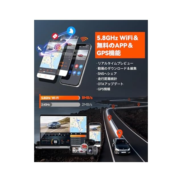 【5GHz Wi-Fi機能&GPS機能】 5GHz/2.4GHz無線LAN機能に対応。お手持ちのスマホと連携して手軽に各種操作やリアルタイムプレビュー、映像確認やシェア、スマートフォンへ転送がPCレスで行えます。また、走行距離の統計機能を搭載し、アプリで走行距離のデータをダウンロードでき、事故の際の強力な証拠にもなります。超便利なOTAアップデートにより、Wi-Fi接続だけで簡単にドラレコのシステムを最新バージョンに更新可能。モリーカードの抜き差しやコンピューターの使用は不要です。GPS機能内蔵で自動で時刻を補正できます。PCビューアでグーグルマップ連携し、車位置、速度、経緯度などGPS情報が表示され、ドライブの思い出を振り返るときにも活躍します。