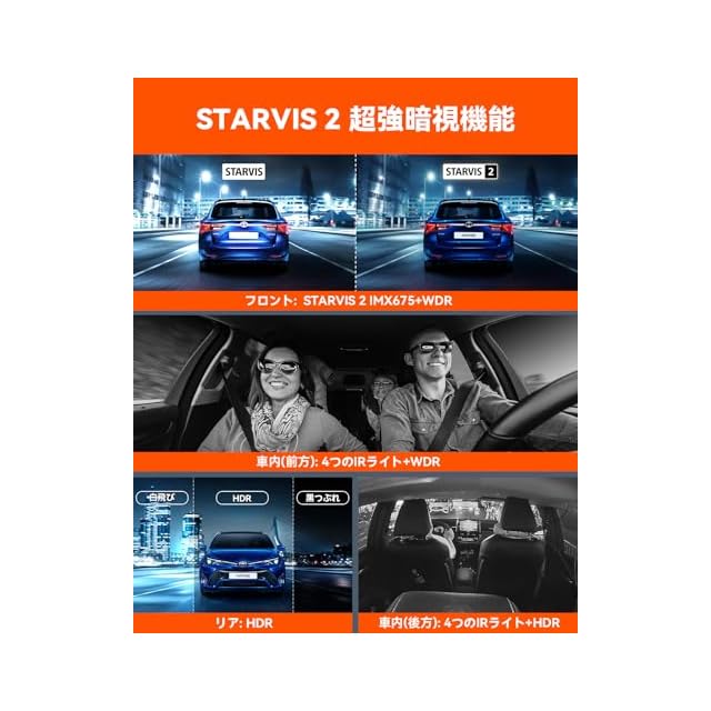 【最先端STARVIS 技術 WDR+HDR 超強暗視機能】フロントカメラには、全世界で先駆けて登場したSTARVIS 2技術搭載のIMX675イメージセンサーを採用、超感光センサーとF1.8の明るいレンズと組み合わせることでさらに暗所での撮像性能を向上させ、街灯のない路地裏のような暗闇でも、クリアな映像が撮影できます。リアカメラには、先端のSTARVIS技術搭載IMX307超感光センサーが搭載されており、フロント/前方車内カメラはWDR技術を、リア/後方車内カメラはHDR技術をサポート、明暗が混在した複雑な照明環境下でも白飛びや黒つぶれを抑え、トンネル/夜間/悪天候などの状況でも高コントラストで撮影した画像を自動で補正し鮮明な映像を撮れます。また、前後の車内カメラには赤外線暗視機能も搭載、暗闇でも表情が見える明るさでトラブルから守ります。この驚異的な性能を持つVANTRUE N5ドラレコは、絶対におすすめの一品です!