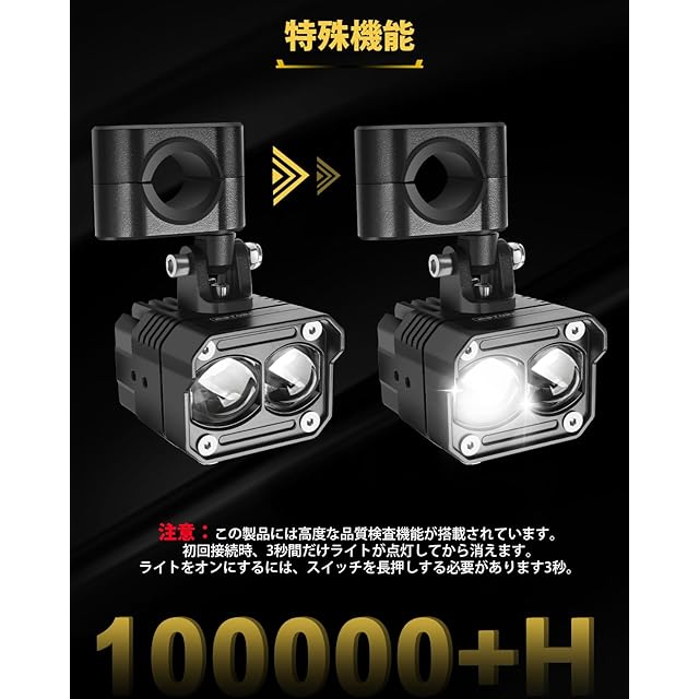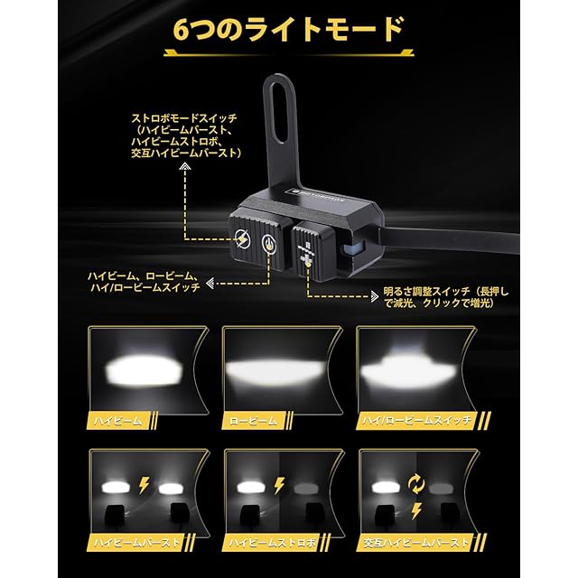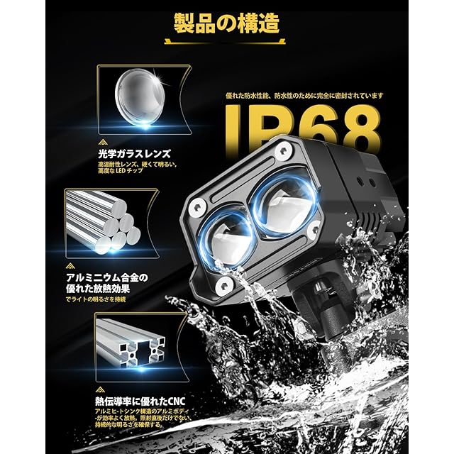 頂級防水性能と耐久性:IP68 の最高防水レベルを誇り、雨天、雪天、泥地などの過酷な気象条件や複雑な地形でも安心して使用できる防水性能。耐久性に優れたポリカーボネートレンズを採用し、長期間にわたって高品質な照明性能を維持。激しい振動や衝撃にも強い、信頼性の高いオートバイ用ライト。