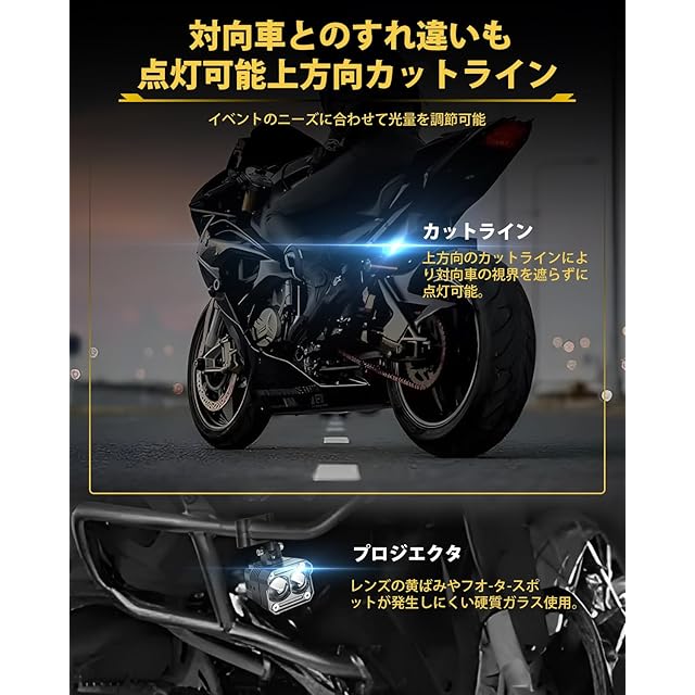 卓越した光透過性と調光機能:グレアがなく、霧や埃の中でも高い透明感を維持する特殊な光学設計。Dimmable(調光可能)な明るさ設計で、長押し操作で簡単に明るさを自在に調整。他の運転者に眩惑を与えることなく、安全な夜間走行を実現するための高品質な光透過性と調光機能を備えたオートバイ照明。