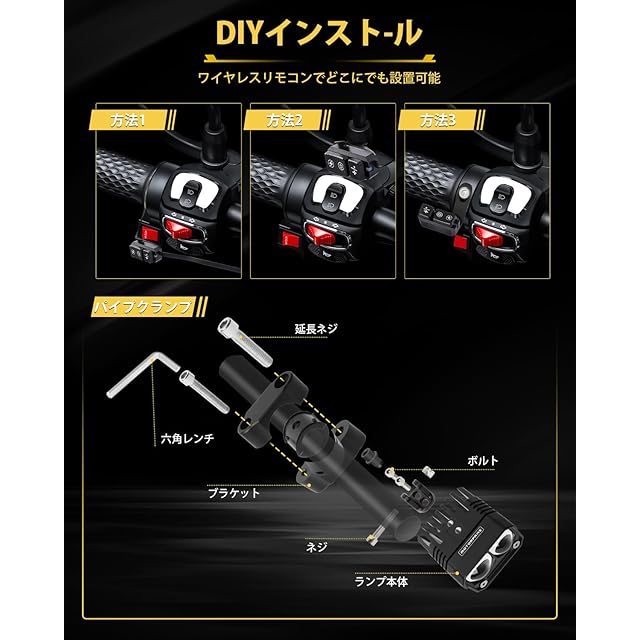 簡単な DIY インストールと充実のパッケージ内容:取り付けに必要な全ての部品が完備されたパッケージ。(2X)オートバイ用 LED ドライビングライト、(1X)マウントブラケットキット、(1X)配線ハーネス、(3 個)スイッチホルダー、(1X)梱包箱が含まれ、詳細な取り付け説明書も付属。追加の配線ハーネス、プラグ、スイッチなどを購入する必要がない、誰でも簡単に DIY インストールできるオートバイライトセット。
