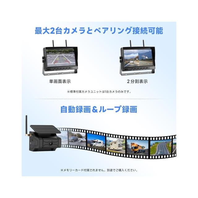 【バックモニターに最大2台カメラとペアリング可能】トラック用バックモニターに最大2台までのカメラとペアリング接続可能ですので、画面表示を単画面、2分割表示に切り替えること可能、車線変更時や前後/左右の安全確認、荷物の盗難や紛失などの時にも活躍します。