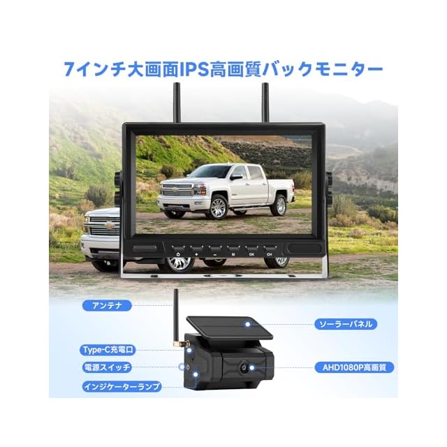 Hizenyo 7インチバックカメラモニターセット ワイヤレス充電式バックカメラ IPSバックモニター 24v 強力磁石搭載 デジタル信号 DC12v~36vまで対応 録画機能付き 1年間メーカー保証 カメラ配線工事不要&1分取付完了