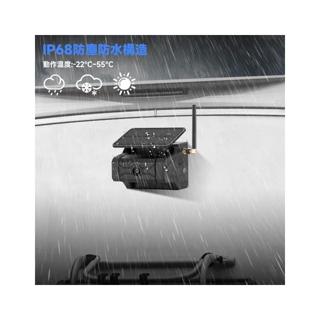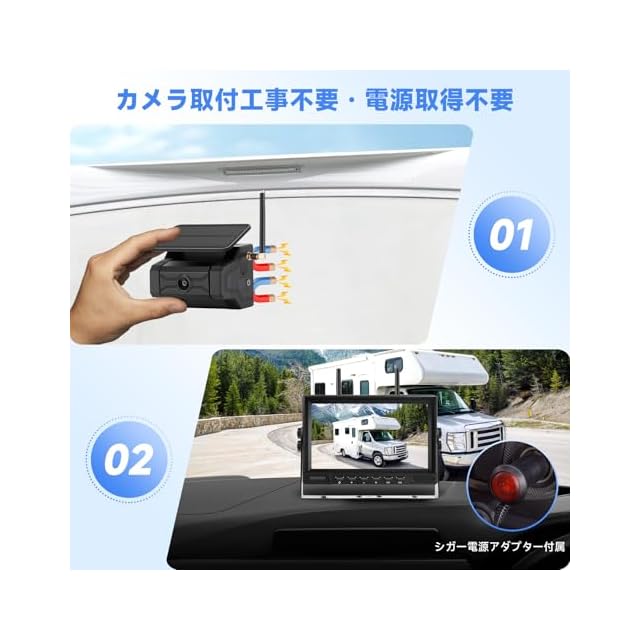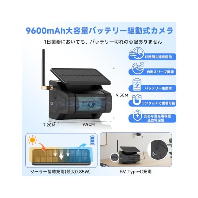 【カメラ配線工事不要・電源取得不要】9600mAh大容量バッテリー駆動式カメラにより、カメラ電源の取得も配線工事も完全不要に!1回充電で約15 時間の連続稼働ができ、オートスタンバイ機能も搭載し、消費電力を大幅に減らします。さらに電池の性能を保護するために、過充電保護および過放電保護も備えます。カメラの長持ちが可能になります。ご注意:24vバックモニター関してはシガー電源アダプターで電力を供給します。またはACC電源から電力を供給できます。