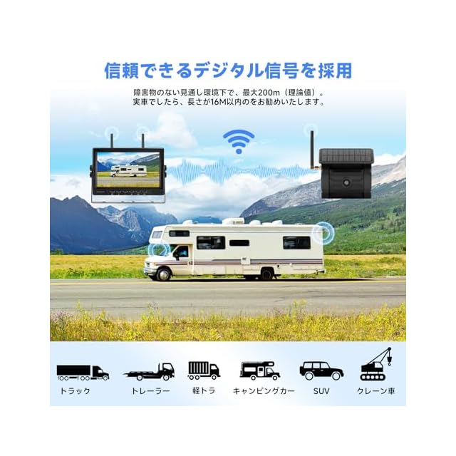 【ワイヤレスバックカメラモニター】ポイントツーポイントデジタル信号を使用しています。信号が安定し、干渉も防ぎます。混線による心配も全くありません!*障害物のない見通し環境下トラック用バックカメラの映像信号が最大200m伝送可能。実際の設置環境では車などに設置する為、車体の材質や厚さなどで映像信号の飛ばす距離も短縮される恐れがあります。通常に長さ16M以内の車両に設置することをお勧めいたします。