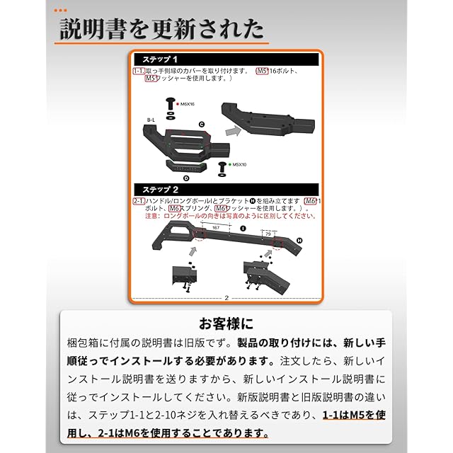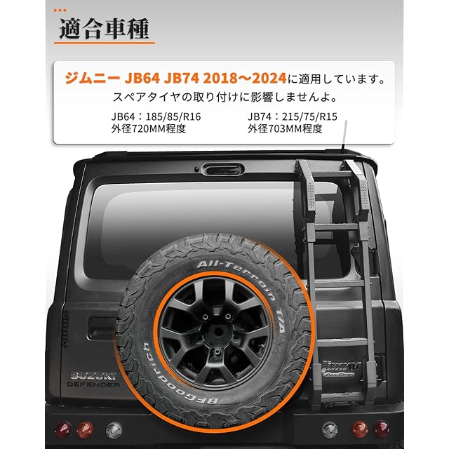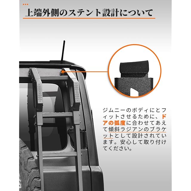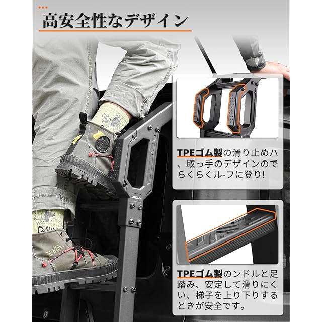 「デザイン」設計点①:取っ手のデザインので、らくらくルーフに登り!取っ手の最外層の材料は滑り止めのTPEゴムです。設計点②足踏みは凹凸のあるの設計は滑り止めと強化されたグリップ力を実現しました。しかも角パイプで、円管設計の足踏みよりも、梯子を上り下りするときのほうが安全で、安定して滑りにくい。安全性が高く、安心できる製品です。設計点③:実車に何度もフィッティング確認し、丁寧に寸法をとった、完璧なデザインでリアゲートの開閉と外径720mmスペアタイヤの取り付けに影響しません。設計点④:取り付け時、ブラケットにクッション材付、車体を傷つけない、きしむ音を防ぐこともでき、とても親切なデザインです。