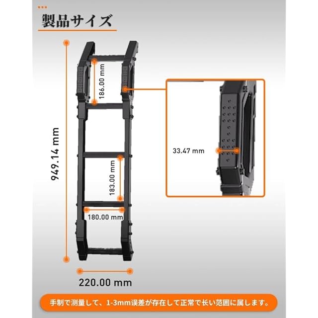 「上質な素材」ジムニー リヤラダーの素材は実心な6063アルミです。6063アルミはより高い耐風圧性、耐食性を持ち、しかもソリッドであるため、非常に丈夫で、しっかりしている。表面の高温溶融プロセスは材料の防食性と防錆性を強化することもでき、悪天候条件に耐え、はしごの寿命を延長することができます。耐负荷200KG。