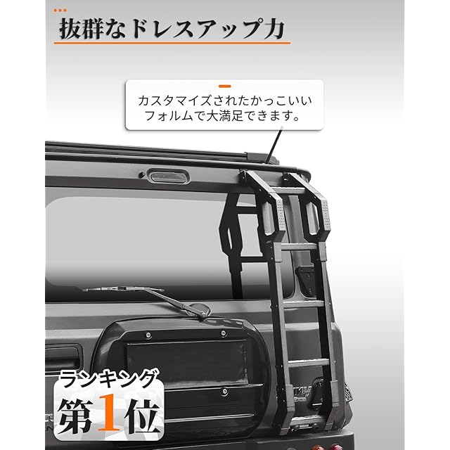 「抜群な装飾效果」探索シリーズ・ジムニー リアラダーを取り付け後、ジムニーの雰囲気が変わりました、形にワイルド感があります。ブラックの塗装はジムニーよりワイルドに仕上げます。どのカラーのジムニーでもよりかっこよくなります。お車の高級感がより一層高まること間違いなしです。お車の雰囲気を損なう事なく最高のフィッティングを体感しています。