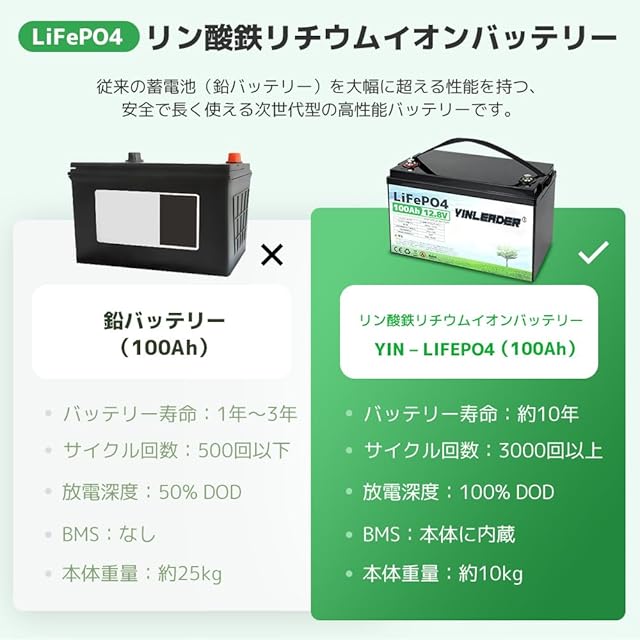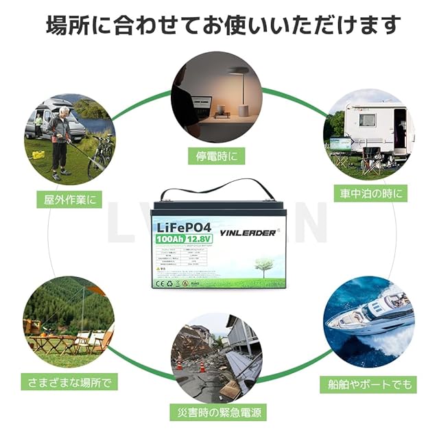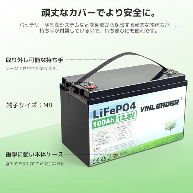 Yinleader 12v 100ah リン酸鉄リチウムイオンバッテリー LiFePO4 1280Wh BMS120A内蔵 3000回サイクル以上可能 10年寿命 BMS保護 直列並列 キャンピングカー 車中泊 アマチュア無線 防災 停電対策 ソーラー充電 Grade-A電池セル-5年保証