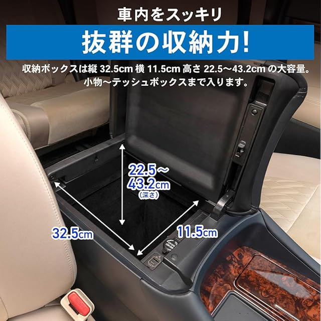 ・POINT.1 「抜群の収納力」 収納ボックスは縦32.5cm 横11.5cm 深さ22.5~43.2cmの大容量。 小物~ティッシュボックスなど大きな物まで入ります。 開閉式のドリンクホルダーを2つ配備しているので、飲み物の置き場にも困りません。 ・POINT.2 「後ろにも収納」 商品の背部にサングラスホルダーと小物入れを配備。 後部座席に乗る方にも快適な車内を提供します。 ・POINT.3 「ジャストフィット」 アルファード ヴェルファイア 専用設計なので、運転中のグラつきはほぼありません。