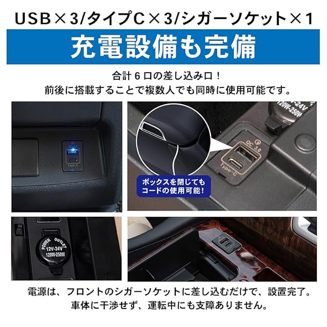 ・POINT.4 「充電設備も完備」 USBを3つ / タイプCを3つ / シガーソケットを1つの計6口の差し込み口を設置。 前後に差し込み口を設置することで、複数人でも同時に使用可能です。 ・POINT.5 「ドライブの優しい味方」 肘置によって乗り心地が段違い変わります 助手席の方でもご利用いただけます。 ・POINT.6 「両開き仕様」 ドライバーと助手席の方、両者が収納ボックスを使いやすいよう 両開き仕様しました。