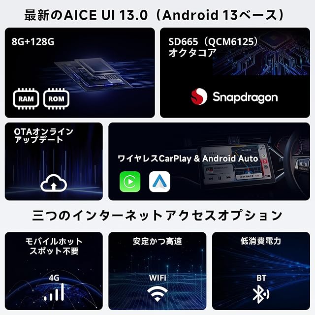 7インチ1280×720 QLEDディスプレイ:X10スクリーンは強い光を抑制し、明るい場所でもクリアな視界を提供。基本的な機能ボタンで操作が簡単で、AICE UI 13.0(Android 13ベース)で動作。オクタコアSD665(QCM6125)SoC、8GB+128GBの構成を搭載。