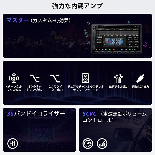内蔵アンプ:M-A-X 4×49W / RMS 4×29Wアンプによる強力なサウンドを実現。4チャンネルフル周波数、2チャンネルサブウーファー出力、2ミッドレンジ出力、2ツイーター出力に加え、光出力と同軸RCA出力も備えています。36バンドのEQとM-asterで、EQ効果をカスタマイズ可能。