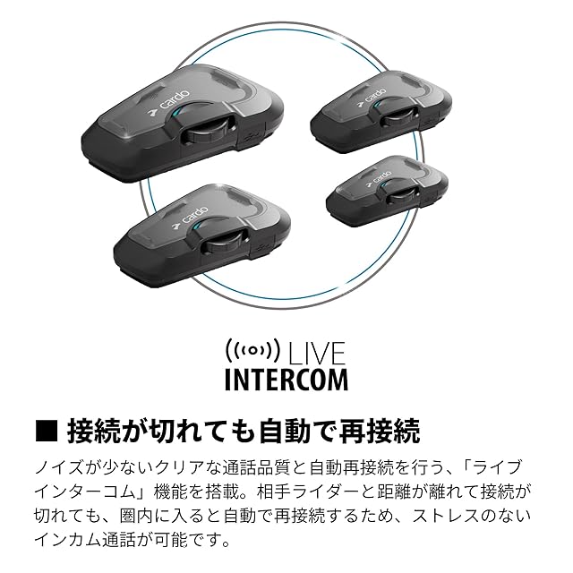 【接続が切れても自動で再接続】ノイズが少ないクリアな通話品質と自動再接続を行う、「ライブインターコム」機能を搭載。相手ライダーと距離が離れて接続が切れても、圏内に入ると自動で再接続します。