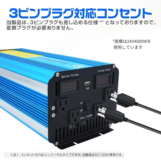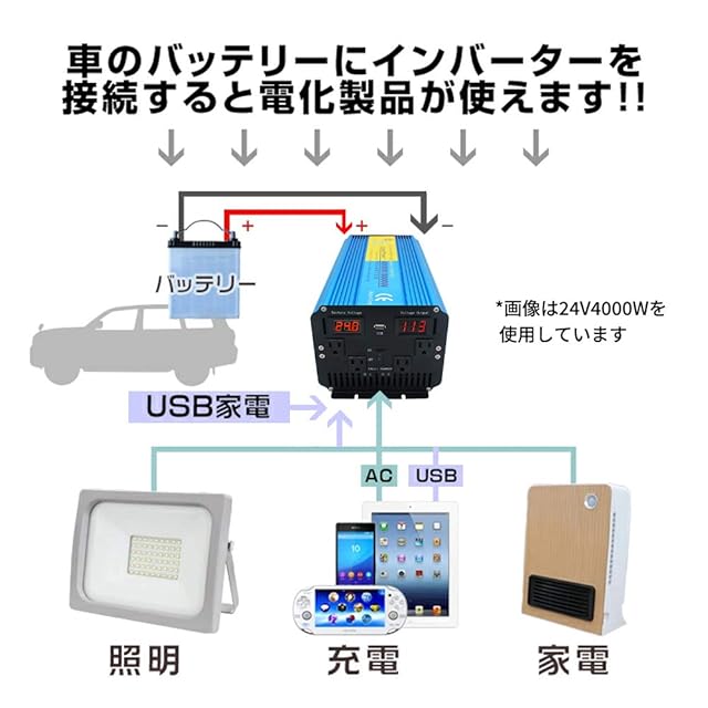 【注意②】家電製品を使用する場合、電化製品の消費電力に合わせた容量のインバーターの使用が必要です。詳細は商品ページ下の商品説明と画像をご参考くださいませ。
