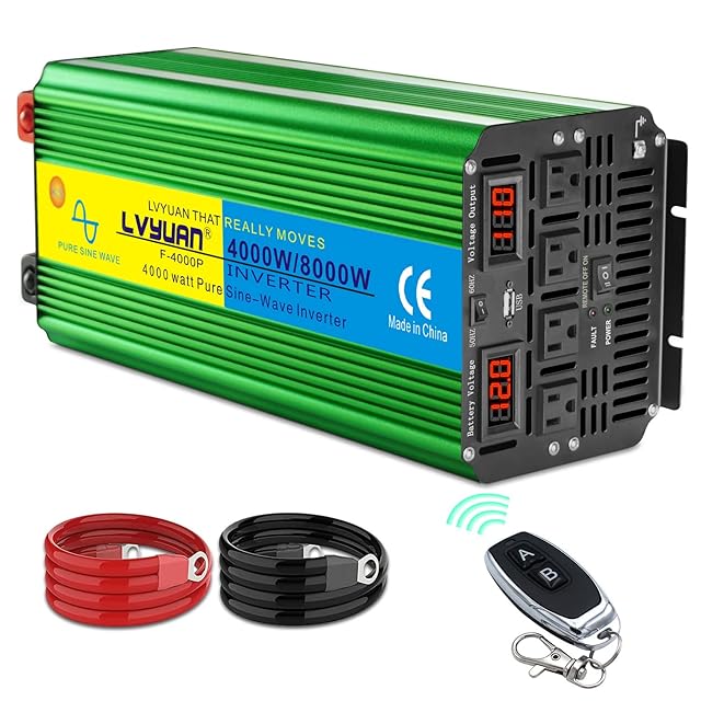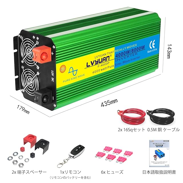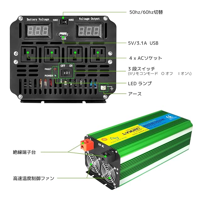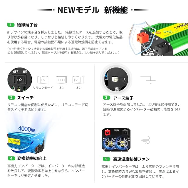 LVYUAN(リョクエン) 電子レンジも動かせる!正弦波インバーター 12V/4000W(瞬間8000W) DC12V(直流) AC100V(交流) 変換 50HZ 60HZ切替 車中泊/太陽光発電/防災対応 緊急時で大活躍 停電の対策!1年 無料交換+永久修理保証 日本語説明書付