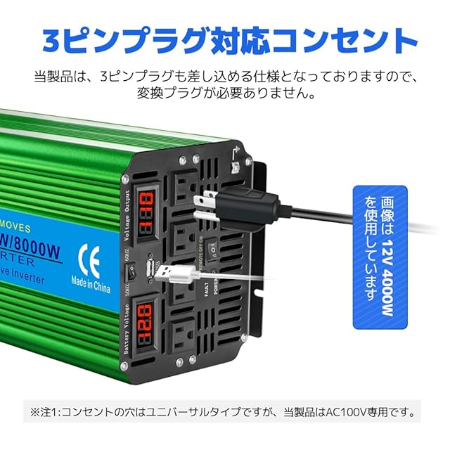✅【製品仕様】入力電圧:DC12V(10-15.5V) 出力電圧:AC100V±5% 定格出力:4000W 瞬間最大出力:8000W 出力波形:純正弦波 インバーターメーカー リョクエンは永久保証を提供していますが、1年以上経過した場合、修理時の送料はお客様負担となります。詳細については店舗のカスタマーサービスにお問い合わせください。