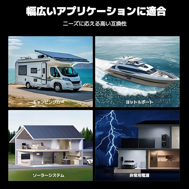 『拡張可能でパワーアップと幅広い用途』VATRER POWER 12V100Ah リン酸鉄リチウムバッテリーは最大より高い電圧(24V / 36V / 48V)とより多くの容量(最大4s4p)を手に入れることができます。倒したり重ねたりも気軽に使えるため、様々なシーンで活躍です。ポータブル電源 リン酸鉄バッテリーは震災時の予備バッテリー、照明、デジタルカメラ、、電動アシスト自転車、水中ライト、魚群探知機、RVなどに適用します。注意:このバッテリーは電力貯蔵用として設計されており、パワーバッテリーとしての使用には適していません。